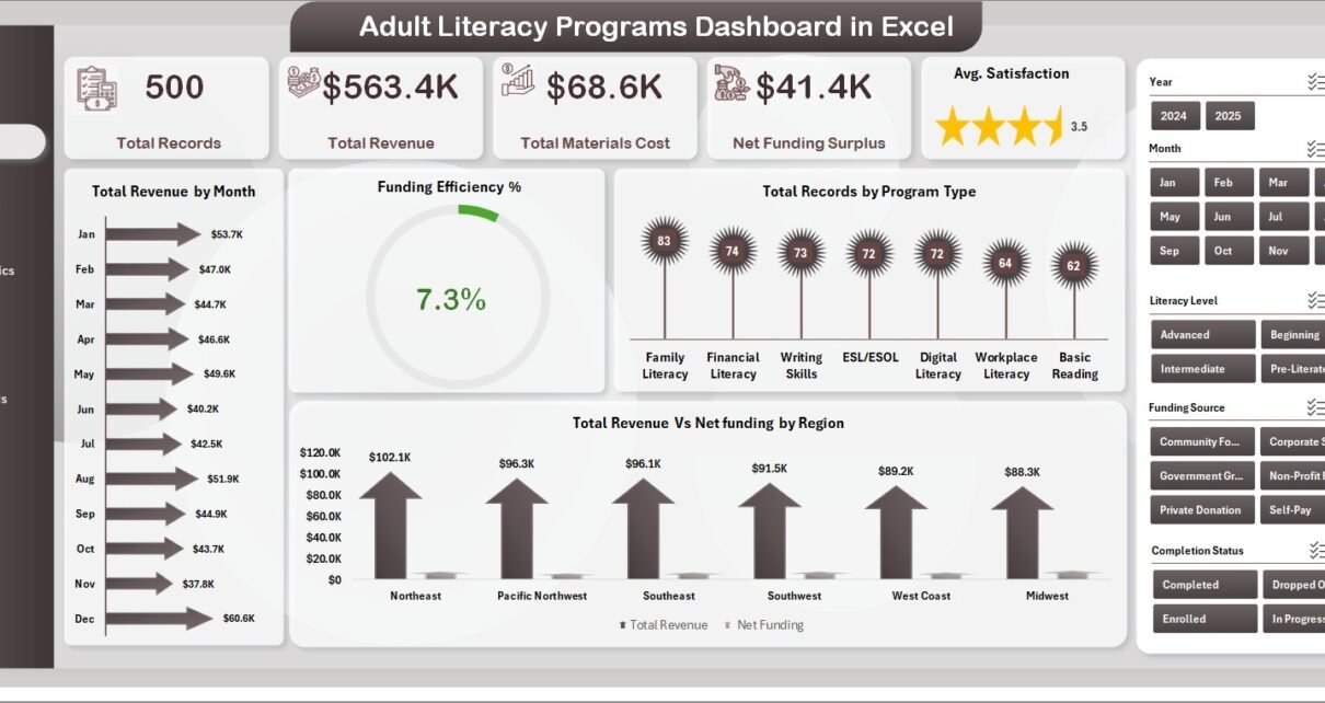 Managing adult literacy programs involves tracking enrollment numbers, monitoring revenue and materials costs, evaluating funding sources, measuring learner satisfaction, and analyzing completion rates across multiple program types, literacy levels, regions, and demographics. Without a structured analytics tool, critical trends in program performance, learner engagement, and funding efficiency can go unnoticed. This Adult Literacy Programs Dashboard in Excel solves that challenge by providing 5 dedicated analysis pages, dynamic KPI cards, interactive charts with slicers, and a pivot-driven architecture that updates every visualization with a single click.