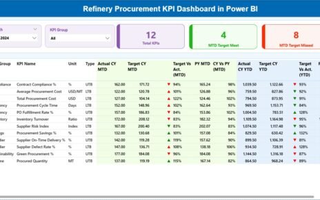 A Refinery Procurement KPI Dashboard in Power BI is a ready-to-use, interactive analytics solution designed to track, measure, and analyze