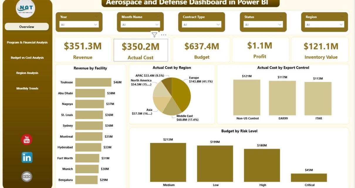 The aerospace and defense industry operates in a high-risk, high-investment environment. Organizations manage billion-dollar contracts, complex supply chains, strict export controls, and performance-critical systems. Therefore, decision-makers must track financial performance, operational readiness, and program health in real time.However, traditional spreadsheets and static reports slow down analysis. As a result, executives struggle to see cost overruns, budget gaps, and performance risks quickly.So, how can aerospace and defense companies gain complete visibility?You need an Aerospace and Defense Dashboard in Power BI.This interactive dashboard centralizes revenue, cost, inventory, readiness, risk level, and performance metrics into one structured system. Moreover, it allows leadership teams to monitor KPIs instantly, compare actual vs budget, and identify trends across facilities and regions.