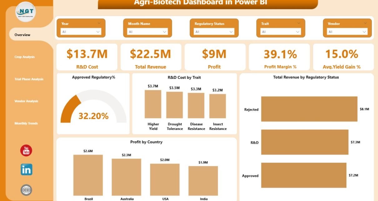 The Agri-Biotech Dashboard in Power BI provides a powerful solution for monitoring biotechnology research and agricultural performance.
