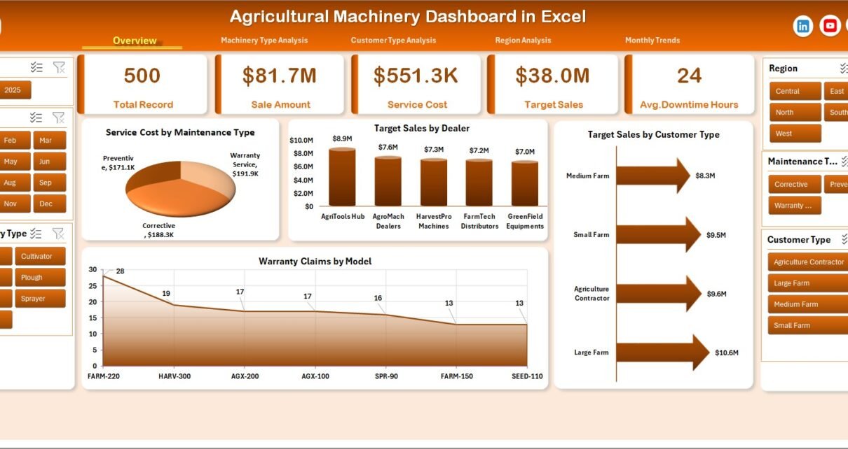 The Agricultural Machinery Dashboard in Excel provides a powerful solution for monitoring machinery sales, service performance, customer behavior, and regional demand.