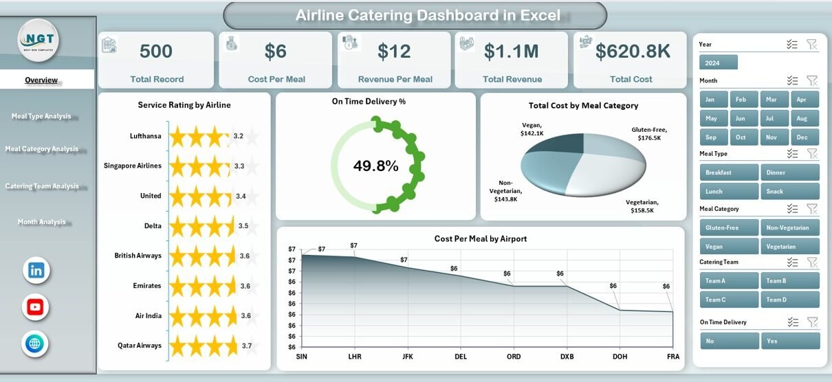 The Airline Catering Dashboard in Excel is a practical, interactive, and business-focused solution for monitoring airline catering performance. It helps users track service rating, on-time delivery, meal cost, revenue, cost per meal, and monthly trends from one structured dashboard.