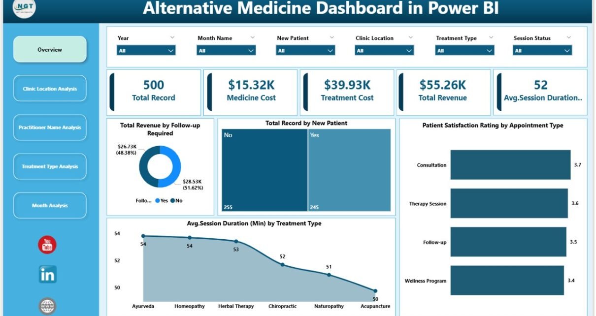 An Alternative Medicine Dashboard in Power BI helps clinics track revenue, appointments, follow-ups, satisfaction ratings, costs, and session duration using interactive visuals and filters.