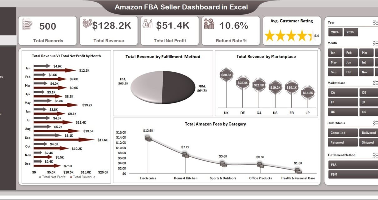 - 15+ Dynamic Charts — Visualize revenue by month, fulfillment method, marketplace, and product category with professionally designed charts that update automatically.