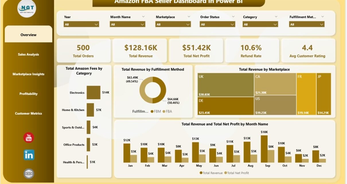 Amazon FBA Seller Dashboard in Power BI is a professionally designed, interactive analytics template built for Amazon FBA sellers, e-commerce managers, and marketplace entrepreneurs who want to track revenue, profitability, customer satisfaction, refund trends, and marketplace performance from a single dynamic Power BI dashboard. This ready-to-use template includes 5 interactive dashboard pages covering Overview, Sales Analysis, Marketplace Insights, Profitability, and Customer Metrics — making it one of the most comprehensive Amazon FBA analytics solutions available in Power BI today.