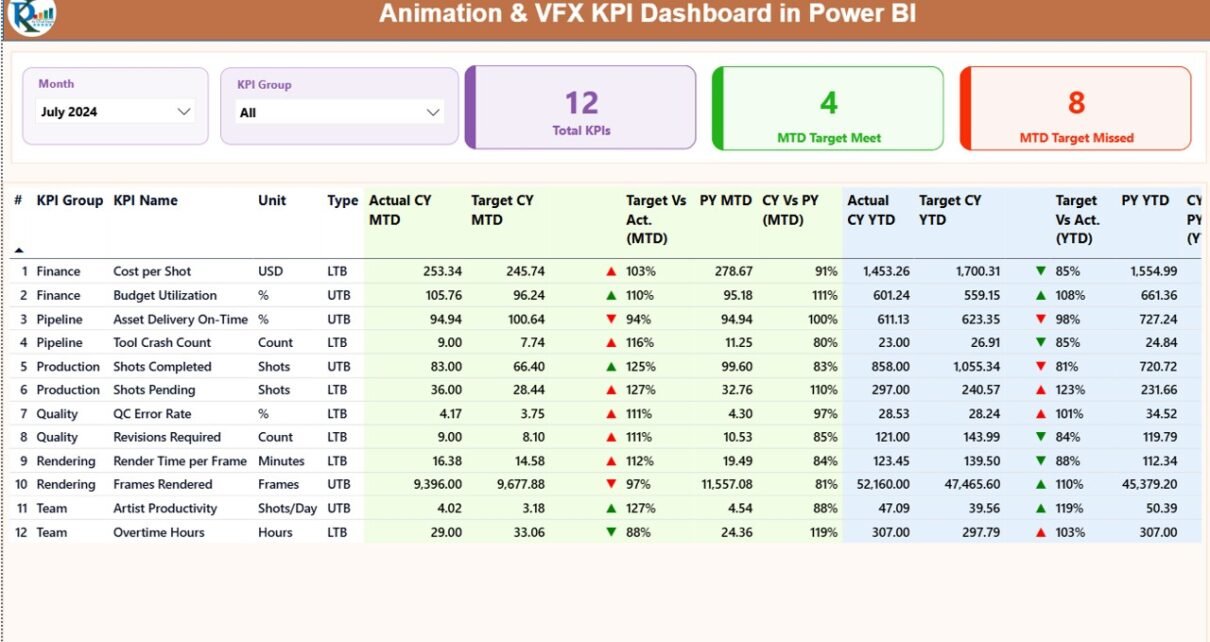An Animation & VFX KPI Dashboard in Power BI helps because it: