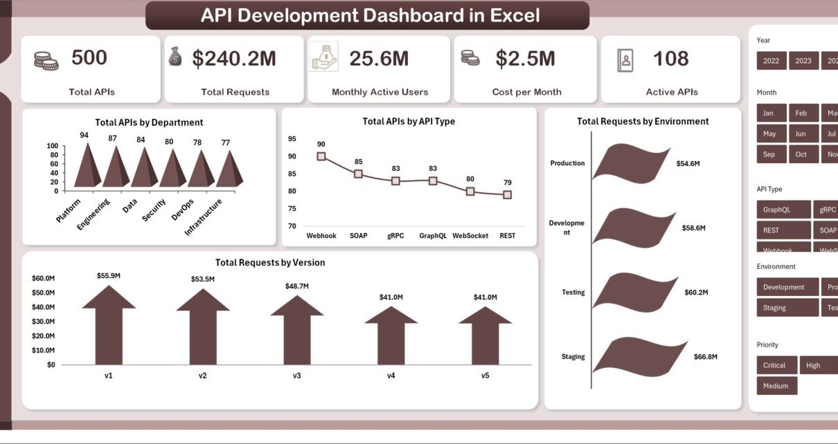 The API Development Dashboard in Excel is a comprehensive, ready-to-use tool designed to help teams effectively track, analyze, and visualize API metrics. By simply updating your data in the Data sheet and refreshing from the Excel Ribbon, the entire dashboard updates instantly, providing meaningful insights through dynamic charts and slicers.