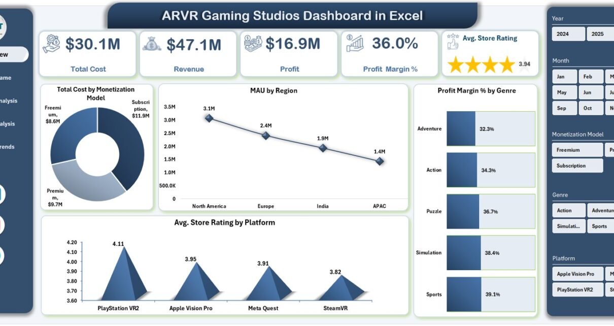 An AR/VR Gaming Studios Dashboard in Excel is a ready-to-use analytical template designed to help gaming studios track and analyze their financial performance, user engagement, platform performance, regional trends, and monthly growth from a single Excel file.