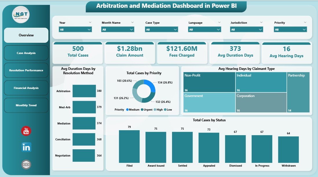 This dashboard includes five interactive pages designed to provide complete visibility into arbitration and mediation performance.