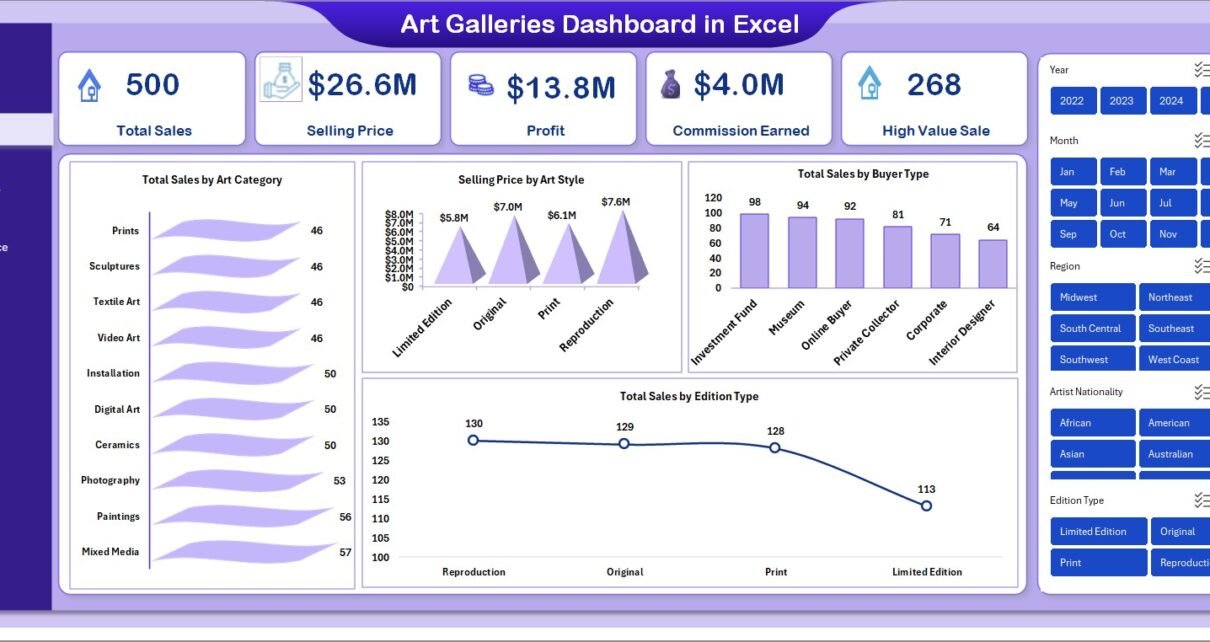 The Art Galleries Dashboard in Excel offers a complete solution to manage, analyze, and grow your art business.