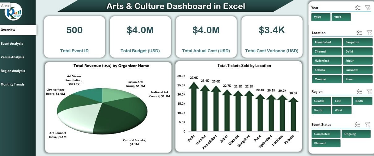 An Arts & Culture Dashboard in Excel is a data visualization and management tool designed for organizations that manage cultural programs, events, and exhibitions. It consolidates multiple data points — such as event budgets, ticket sales, sponsorships, and artist participation — into one organized system.