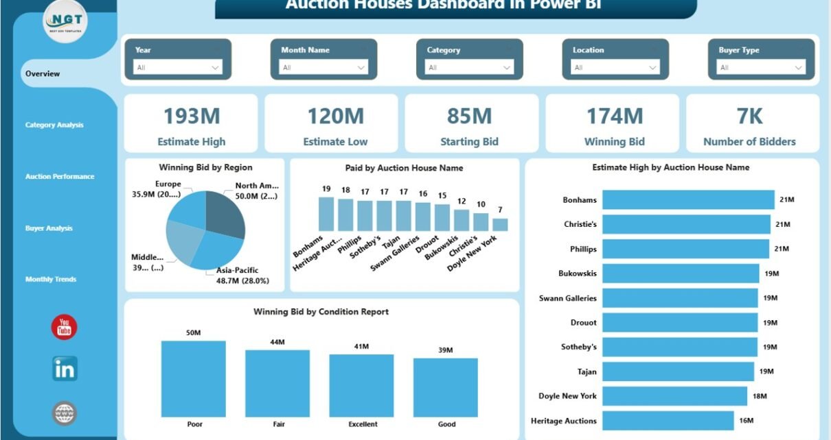An Auction Houses Dashboard in Power BI is a dynamic data visualization tool designed to track and analyze auction-related metrics in real time.