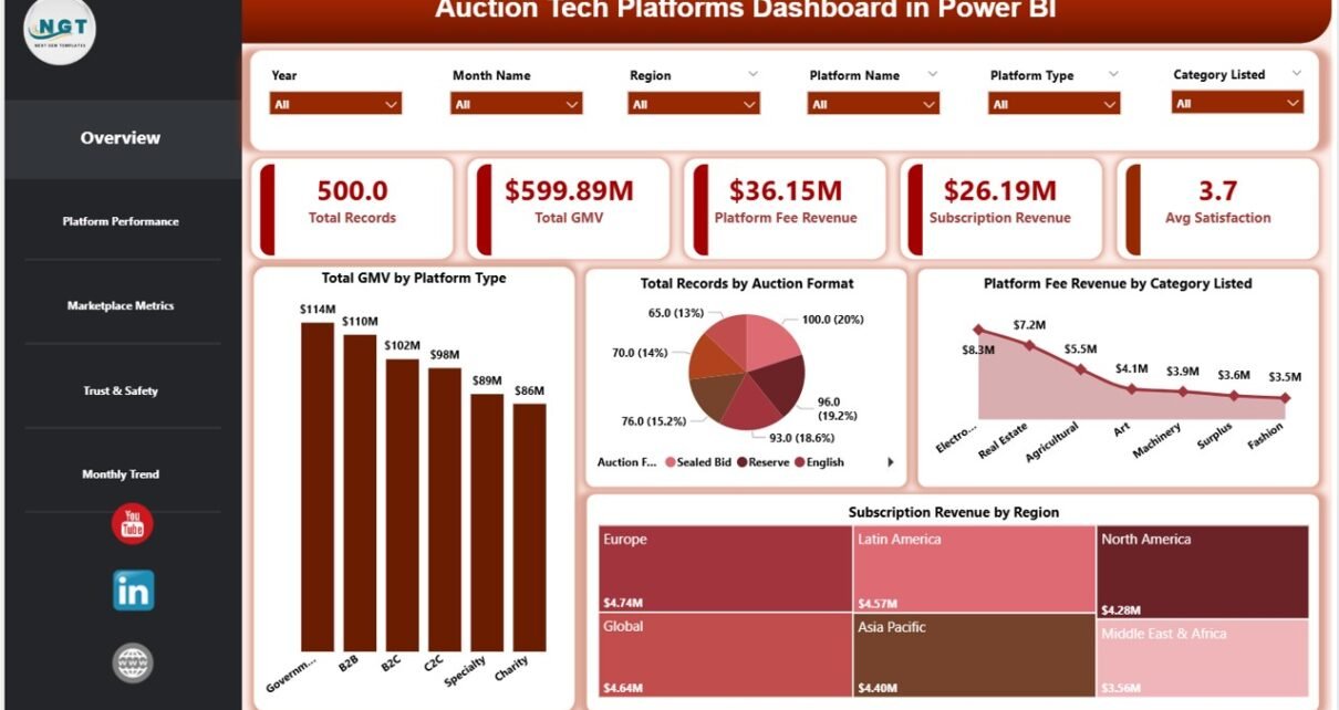 An Auction Tech Platforms Dashboard in Power BI is a dynamic reporting tool designed to monitor and analyze key metrics related to auction marketplaces.