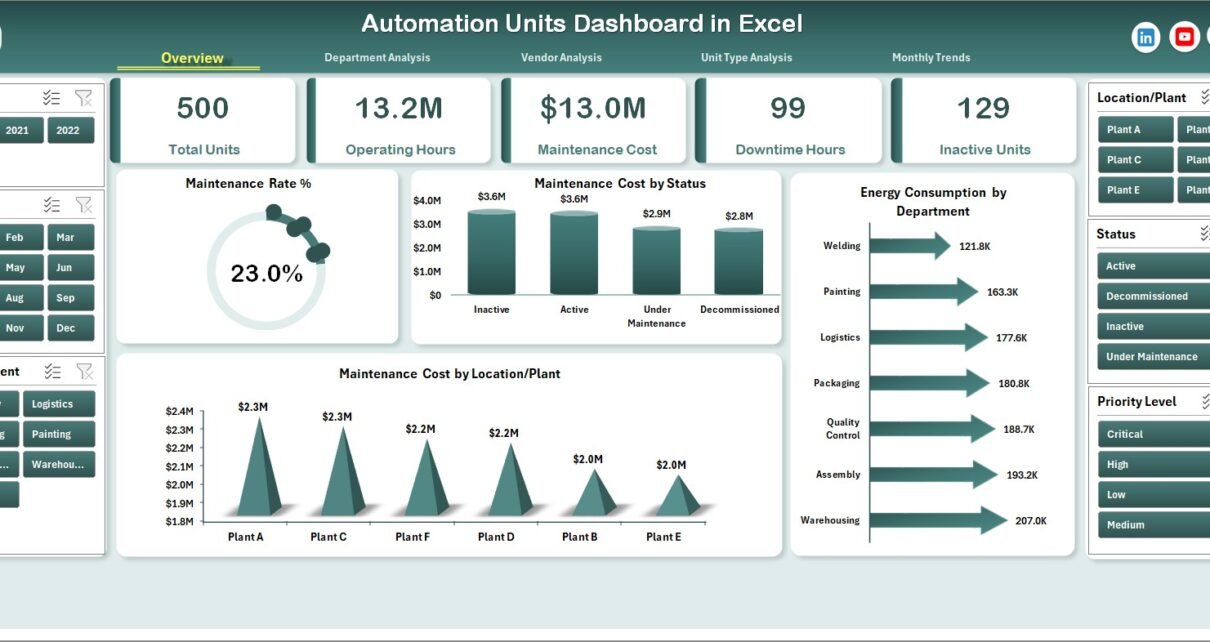 An Automation Units Dashboard in Excel is an interactive reporting tool that helps organizations track the performance of automated equipment and machines across departments, vendors, and operational units.