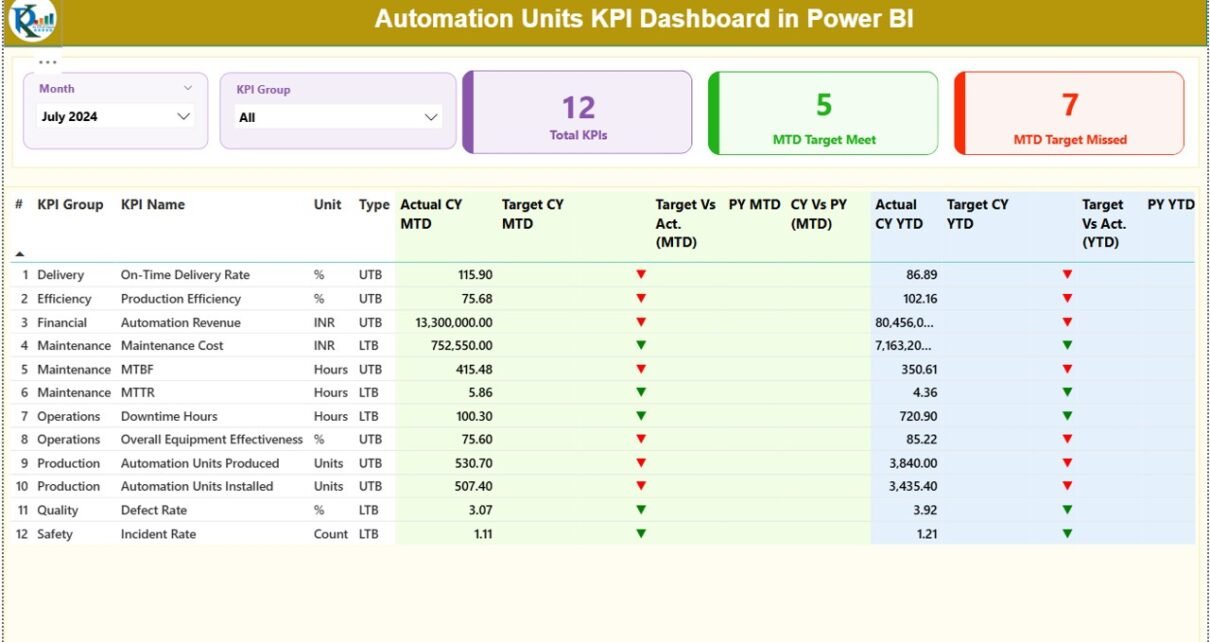 An Automation Units KPI Dashboard in Power BI is a centralized analytical tool that visually tracks key performance indicators related to automation units. Instead of checking multiple Excel files or manual reports, decision-makers can monitor automation efficiency, output, reliability, and goal achievement from a single interactive dashboard.