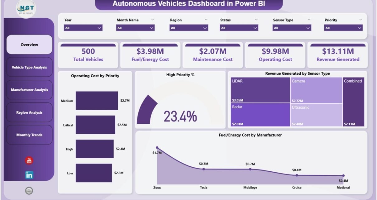 An Autonomous Vehicles Dashboard in Power BI is a dynamic data visualization tool designed to analyze and monitor fleet performance in real time.