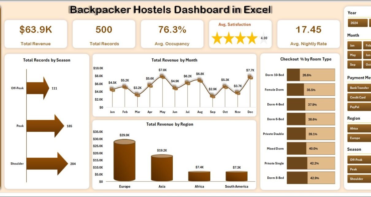 A Backpacker Hostels Dashboard in Excel is a dynamic and interactive reporting tool designed to track hostel operations in real time. It combines multiple datasets into visual charts, KPIs, and slicers so that you can quickly understand your business performance.