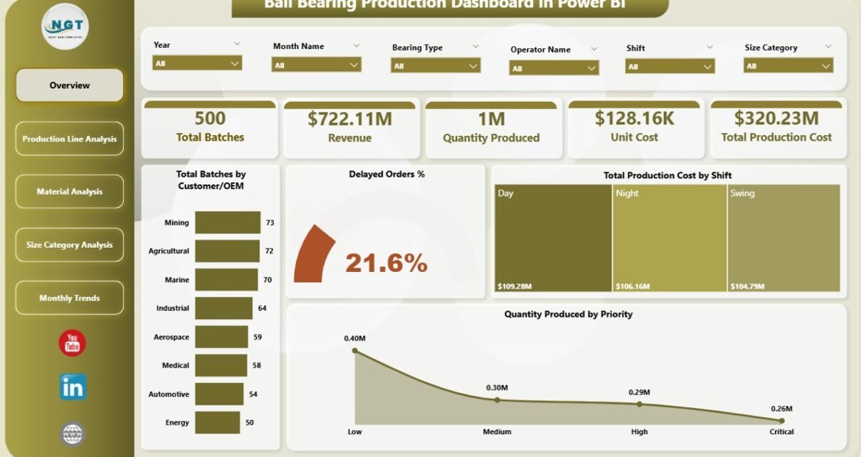A Ball Bearing Production Dashboard in Power BI is an interactive reporting tool designed to monitor and analyze manufacturing performance using real-time data.