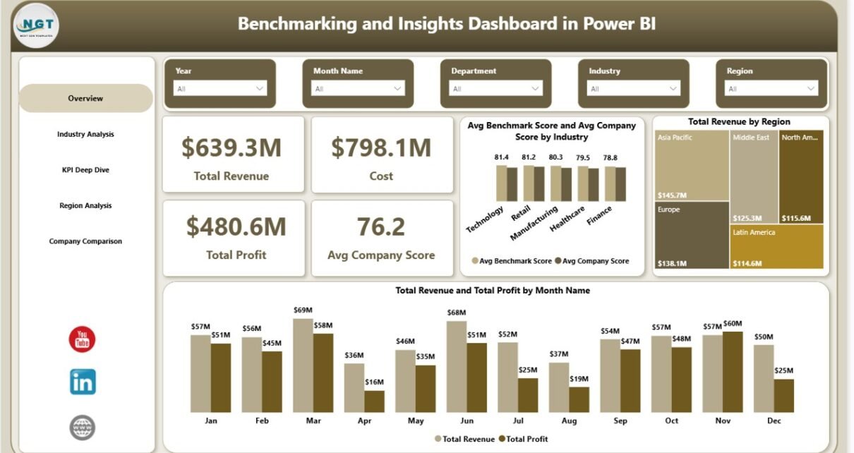 This powerful and interactive dashboard helps businesses compare their performance against industry standards. Moreover, it provides clear insights into revenue, profit, cost, and KPI performance. As a result, decision-makers can act quickly and confidently.