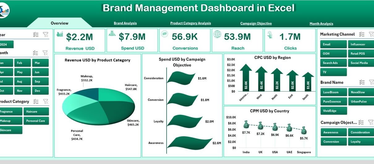 A Brand Management Dashboard in Excel is a ready-to-use analytical tool that tracks your brand’s performance. It converts raw data into interactive charts, cards, slicers, tables, and reports. This dashboard helps marketing managers, brand strategists, product teams, and leadership understand how the brand performs across different regions, campaigns, and product lines.