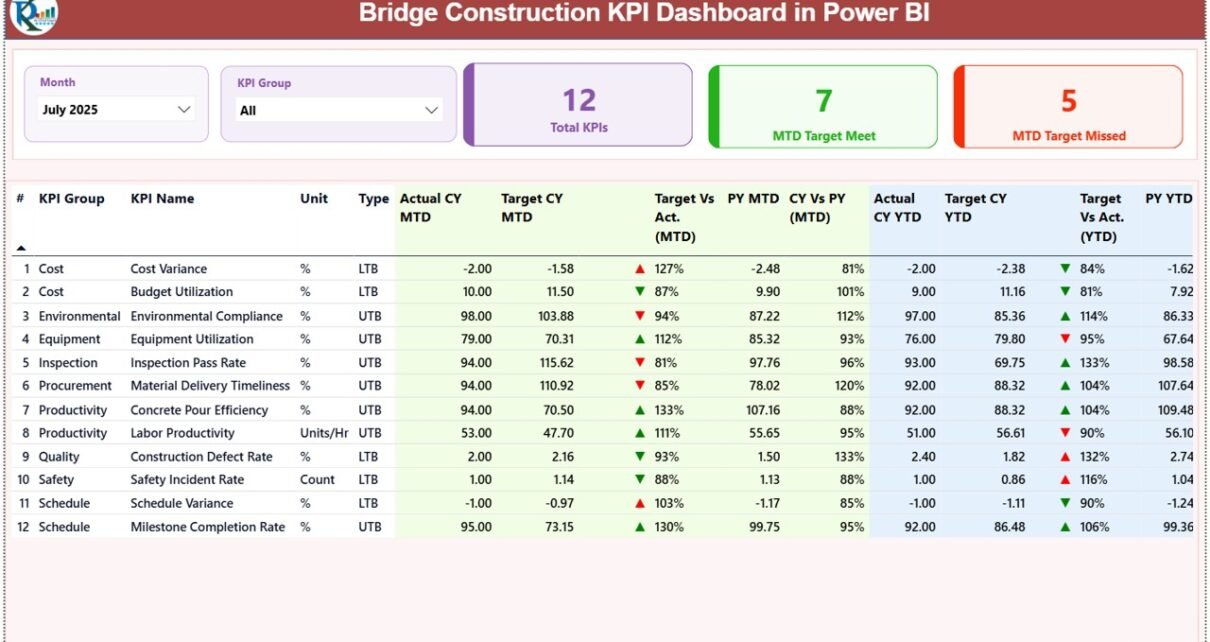 Key Features of the Bridge Construction KPI Dashboard in Power BI