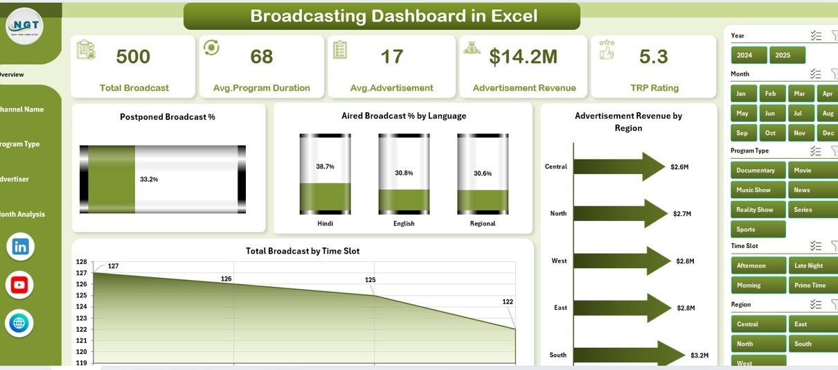 The Broadcasting Dashboard in Excel is a powerful, ready-to-use solution for modern broadcasters. It transforms raw broadcasting data into meaningful insights across channels, programs, advertisers, regions, and months.