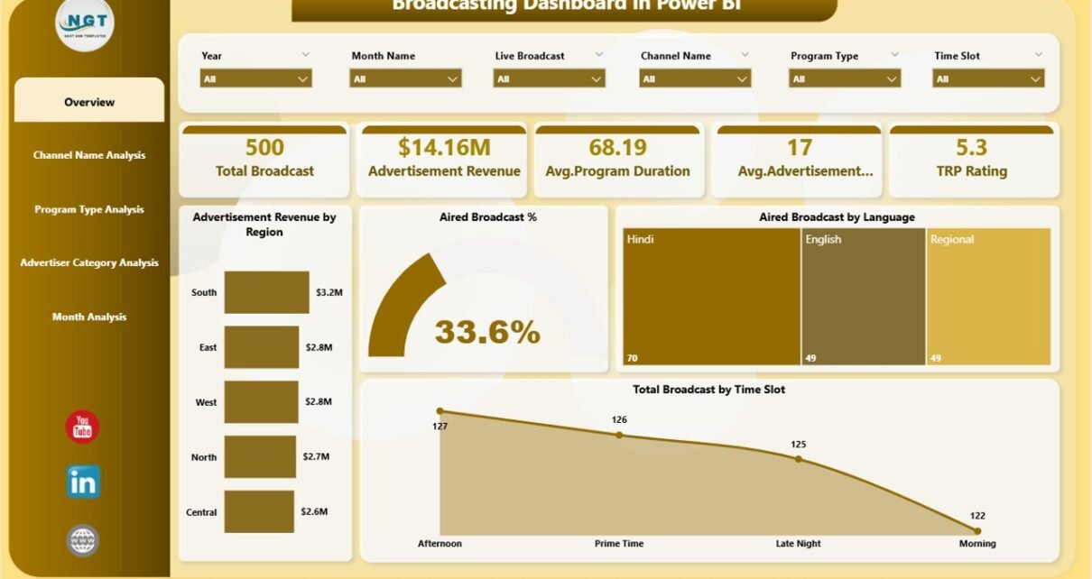The Broadcasting Dashboard in Power BI includes five powerful analytical pages, each designed to answer specific business questions.