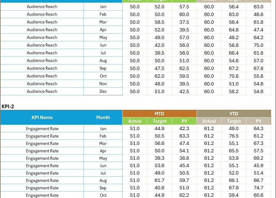 The KPI Trend sheet makes it easy to spot performance fluctuations over months and identify whether trends are improving or declining.