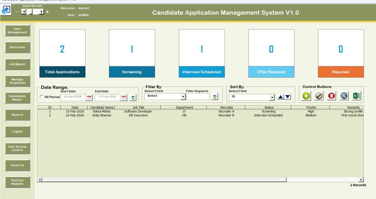 Candidate Application Management System V1.0 is a powerful Excel + VBA-based recruitment management tool. It allows HR teams, recruiters, consultants, and companies to: