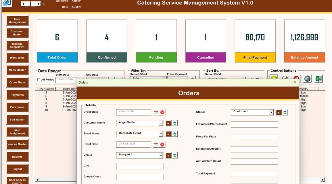 The Catering Service Management System V1.0 in Excel VBA is a ready-to-use Excel and VBA-based management tool designed to help catering businesses manage orders, customers, menus, staff, vendors, payments, and reports from one centralized system.