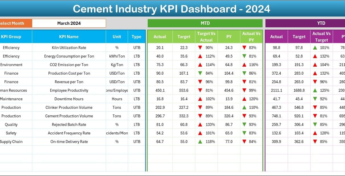 The Dashboard sheet is the heart of the Cement Industry KPI Dashboard. It displays all KPI results in a clean and visual layout.