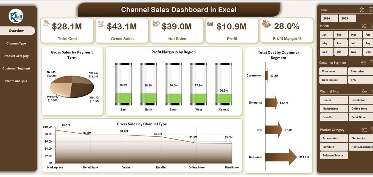 A Channel Sales Dashboard in Excel tracks and displays sales performance across different channels such as retail stores, distributors, online platforms, wholesalers, and direct sales. It converts monthly and yearly data into easy-to-understand visuals like charts, cards, and tables. This dashboard helps you compare channels, measure profitability, check customer segments, and monitor product categories.