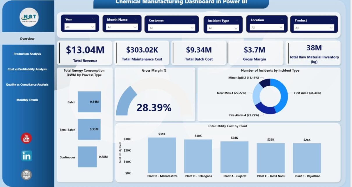 A Chemical Manufacturing Dashboard in Power BI empowers organizations to move from reactive reporting to proactive decision-making. It delivers real-time insights into revenue, cost, quality, energy, and compliance.
