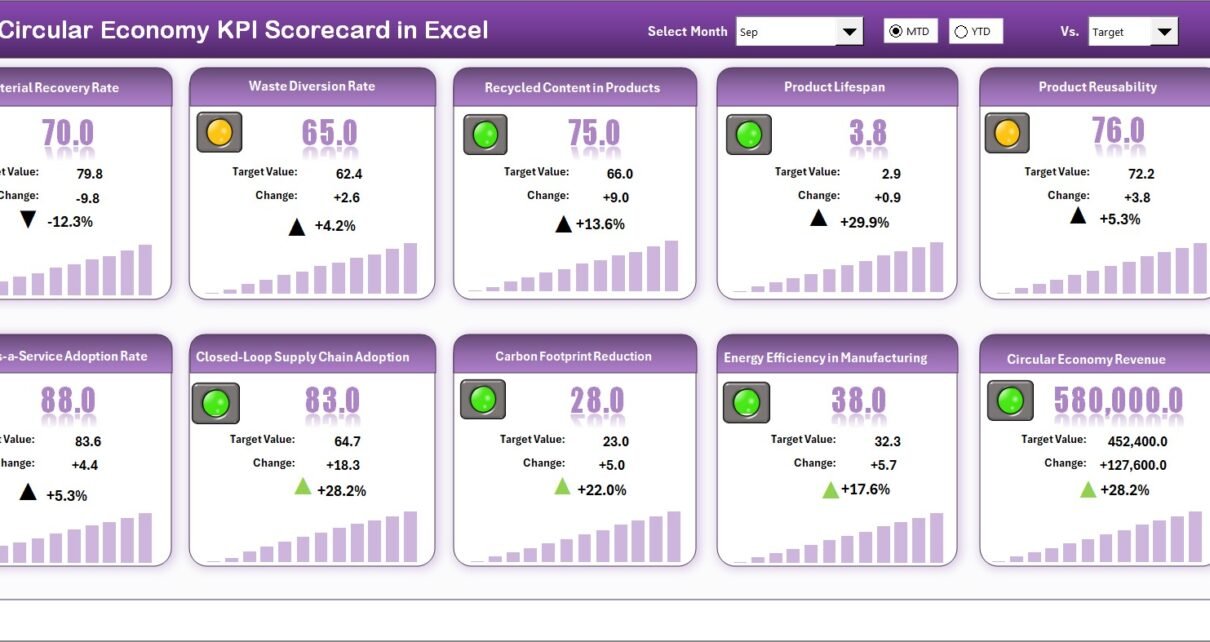 A Circular Economy KPI Scorecard is a tool used to measure sustainability performance using predefined environmental and operational KPIs.