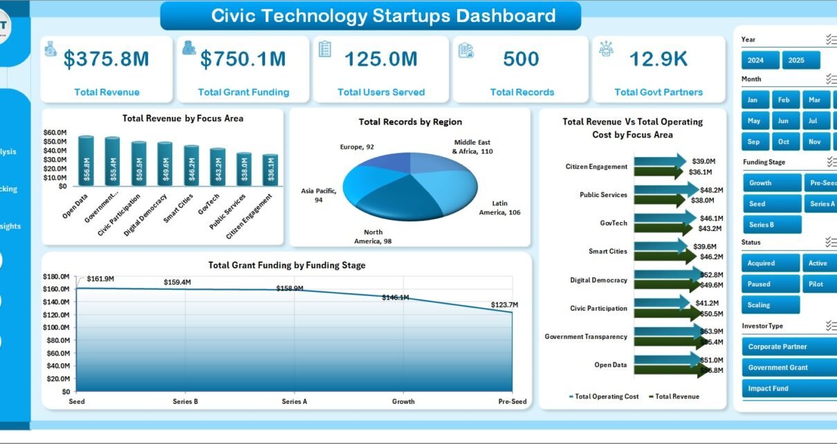 A Civic Technology Startups Dashboard in Excel is a pre-built analytics template that uses pivot tables, charts, and slicers to visualize key performance metrics for civic tech companies — including revenue, grant funding, user adoption, government partnerships, and civic impact scores — all within a single Excel workbook.