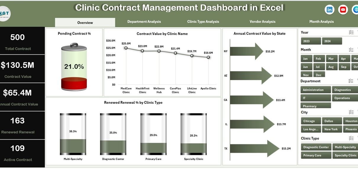 A Clinic Contract Management Dashboard in Excel solves these issues by: