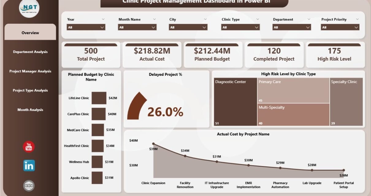 With structured pages like Overview, Department Analysis, Project Manager Analysis, Project Type Analysis, and Monthly Trends, clinics achieve complete project visibility. As a result, budgets remain under control, risks stay visible, and projects deliver on time.