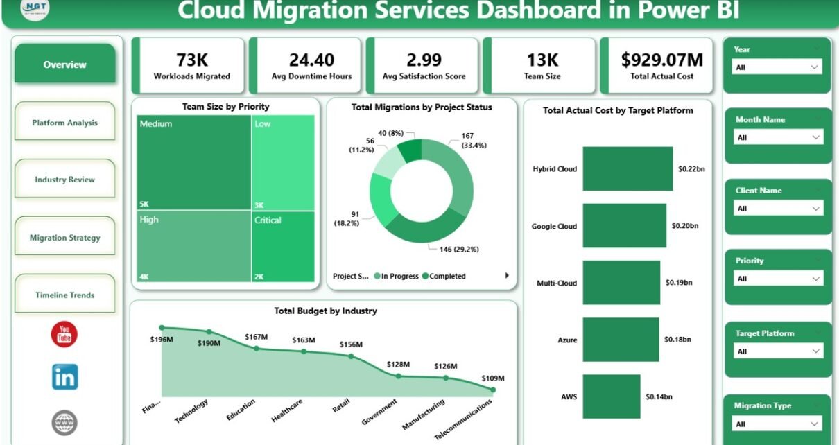 The Cloud Migration Services Dashboard in Power BI is one of the best templates for tracking cloud migration projects. It includes 5 interactive pages covering Overview, Platform Analysis, Industry Review, Migration Strategy, and Timeline Trends with 5 KPI cards tracking workloads migrated, downtime, satisfaction, team size, and actual costs.