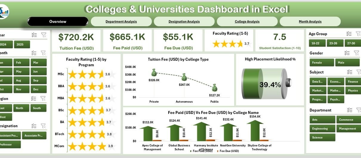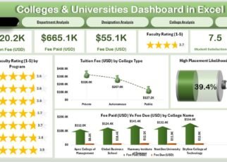 In today’s data-centric education environment, higher education institutions generate enormous amounts of data every single day. From tuition fees and faculty ratings to student satisfaction and departmental performance, the numbers can quickly become overwhelming. That’s where the Colleges & Universities Dashboard in Excel comes in — a ready-to-use, interactive template that helps educational administrators visualize, analyze, and make sense of academic and operational data effortlessly.