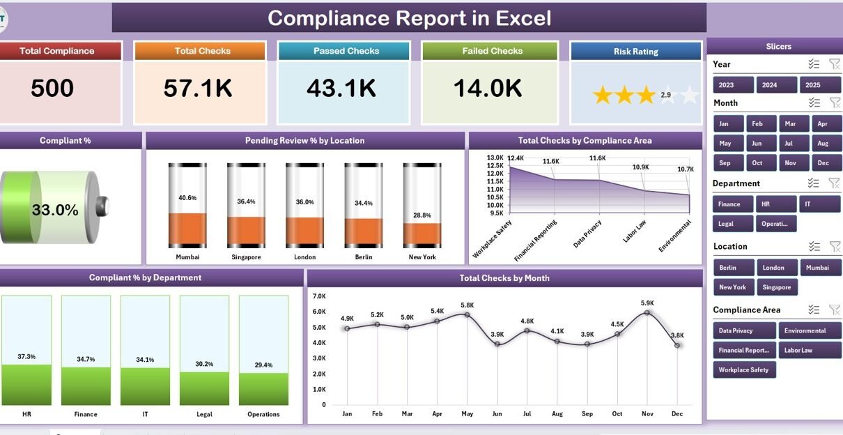 It uses data visualization, slicers, and automated formulas to summarize compliance checks, pending reviews, and audit performance. The report gives users a clear picture of compliance status and risk exposure—without the need for complex software.