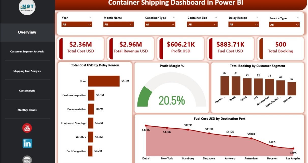 A Container Shipping Dashboard in Power BI transforms complex shipping data into clear, actionable insights. It helps organizations control costs, optimize fuel usage, improve customer profitability, and monitor performance trends effectively.