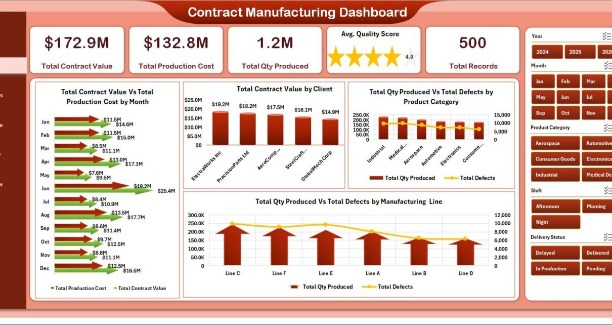 🏭 Contract-Manufacturer-Specific Metrics: Contract Value vs. Production Cost by Month / Year / Category, Defect Rate % by Manufacturing Line, Net Profit by Client, Quality Score by OEM partner. These are the metrics plant managers at tier-1 and tier-2 shops actually care about.