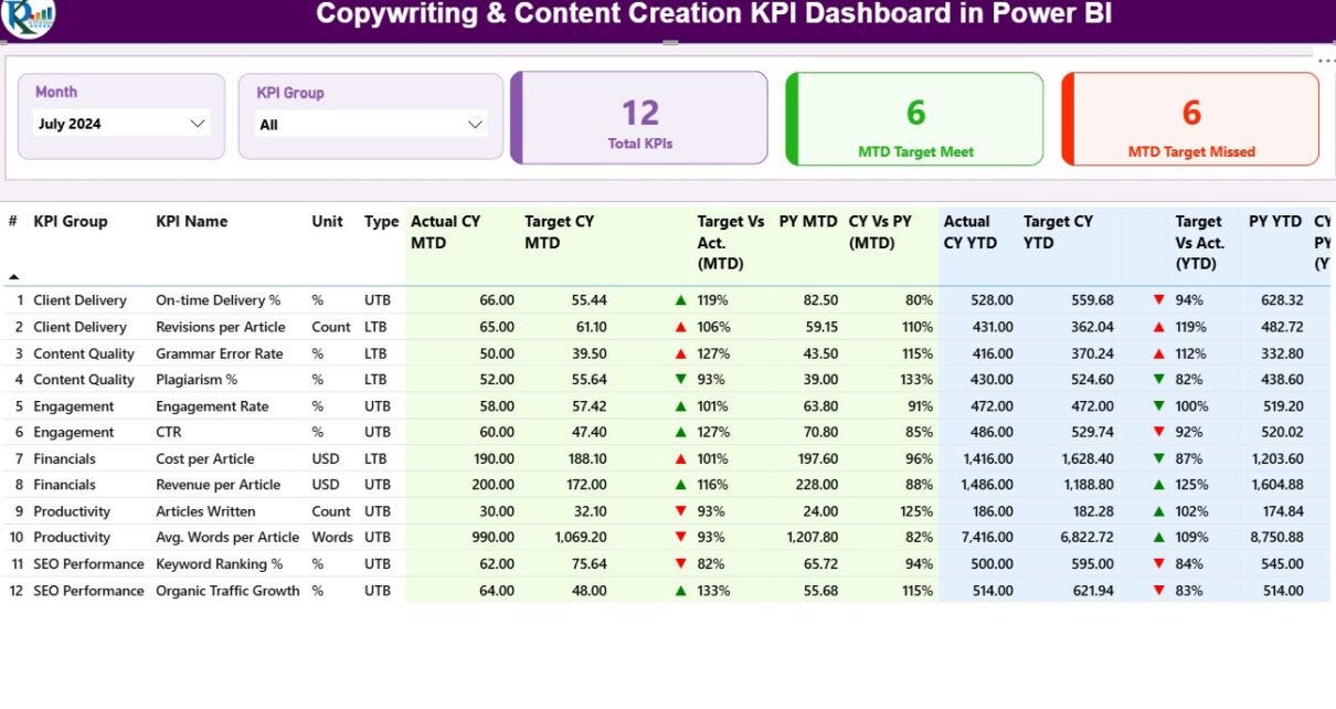 By connecting this dashboard to a structured Excel data source, teams can visualize content performance trends, compare targets versus actual results, and identify which areas of copywriting and content creation need improvement.