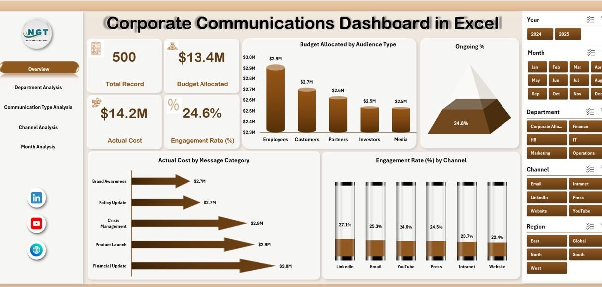 A Corporate Communications Dashboard in Excel is a ready-to-use performance tracking system designed to monitor communication budgets, campaign performance, audience engagement, and departmental communication effectiveness.