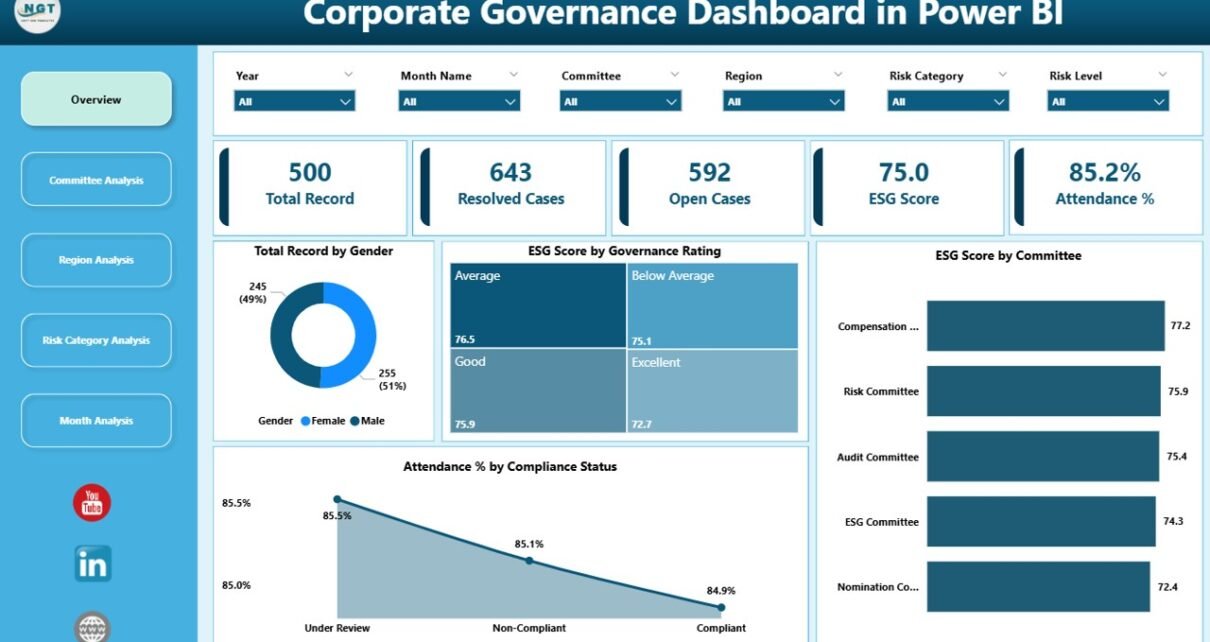 A Corporate Governance Dashboard in Power BI centralizes governance data and converts it into powerful visual insights. Moreover, it strengthens ESG monitoring, improves compliance tracking, and enhances risk management.