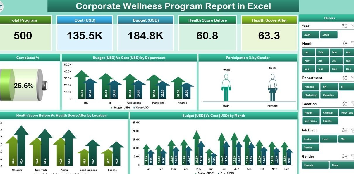 Using Excel as the foundation allows for flexibility, customization, and scalability. Whether your company runs fitness sessions, mental health workshops, nutrition programs, or annual wellness checks, this report can adapt to your specific data structure.