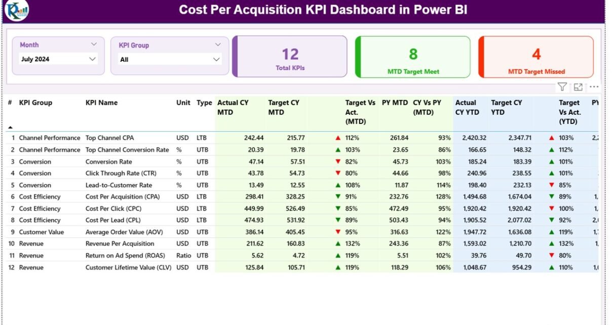 The dashboard helps decision-makers track monthly trends, year-to-date (YTD) performance, and compare results with previous years. With features like conditional formatting, drill-through capability, and trend visualization, users can instantly identify whether acquisition efforts are within target or exceeding cost expectations.