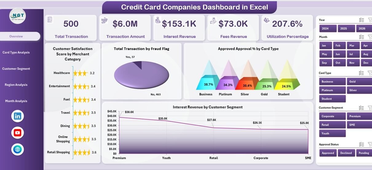 The Excel dashboard includes five powerful pages designed to analyze credit card performance from multiple perspectives.