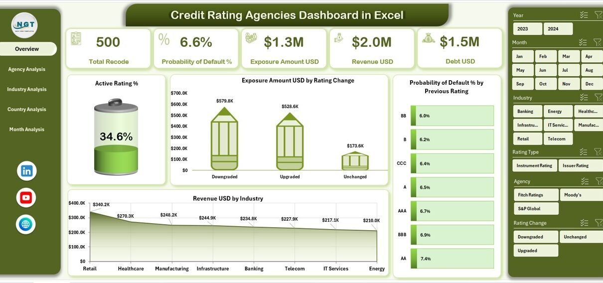 A Credit Rating Agencies Dashboard in Excel is an interactive and centralized reporting tool designed to analyze credit ratings, exposure, probability of default, debt, and revenue across agencies, industries, countries, and time periods.