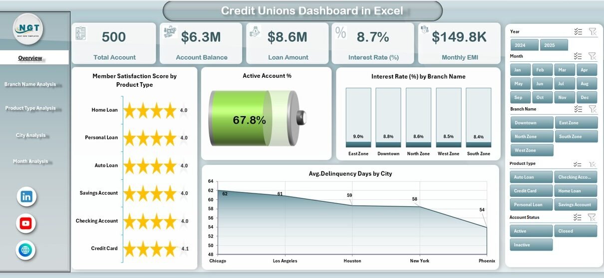 A Credit Unions Dashboard in Excel is a visual reporting tool that tracks KPIs like member satisfaction, loans, balances, interest rates, and delinquency using interactive charts and slicers.